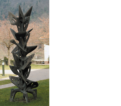 Der Künstler (1908–1967) zählt zu den bedeutendsten deutschen Bildhauern der Nachkriegszeit. Seine Arbeiten sind inspiriert von den Formen der Natur, so auch die drei Meter hohe Säulenplastik aus Bronze. Hartungs Werke haben nichts Monumentales, sondern – bei aller Abstraktion – immer einen Bezug zum Menschen. Die Flügelsäule strebt nach oben, als wolle sie sich von der Erdenschwere lösen. Doch die Oberfläche wirkt porös, vertrocknet, erstarrt – ein Sinnbild der Vergeblichkeit.